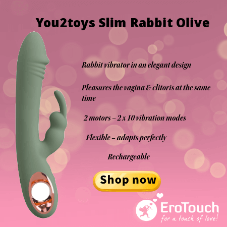 The elegant and easy-to-use dual vibrator, Slim Rabbit Olive from You2Toys, is great for double the amount of action: the vagina and clitoris can enjoy simultaneous stimulation!