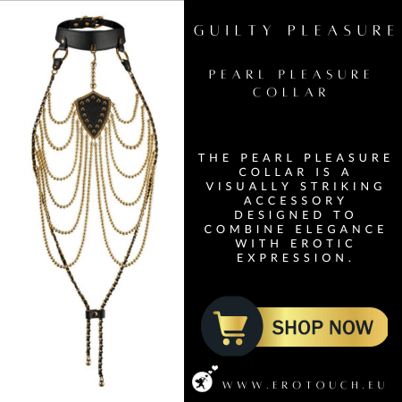The Pearl Pleasure Collar is a visually striking accessory designed to combine elegance with erotic expression. Blending fashion aesthetics with intimate functionality, this adjustable collar features soft vegan leather paired with cascading pearl strands and gold-toned detailing — creating a luxurious look that transitions seamlessly between sensual wear and provocative styling.