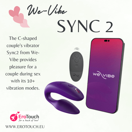 The C-shaped couple’s vibrator Sync2 from We-Vibe provides pleasure for a couple during sex with its 10+ vibration modes.