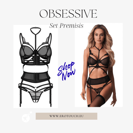 An underwired bra, suspender belt and crotchless string is in the Premisis set from Obsessive. The set is made out of delicate transparent black material with sensual lace details and decorative stretchy straps. The set is soft and stretchy for a very comfortable it.