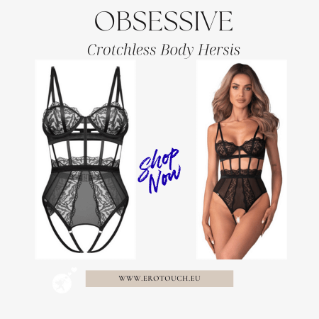 The crotchless black Hersis body by Obsessive is made out of delicate lace with transparent inserts. It is soft, stretchy and in an extravagant strap design.