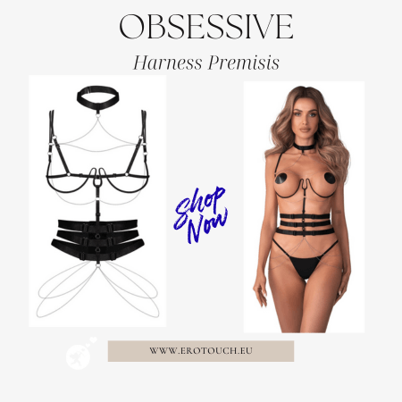 The stylishly bold Premisis harness from Obsessive Premium is in a unique design and made out of high-quality materials with a handcrafted finish. The black one-piece consists of a choker, an open cup bra and a waist harness with 3 straps.