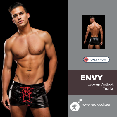The Envy Menswear Lace-Up Wetlook Trunks redefine contemporary men’s underwear with a bold and seductive design.