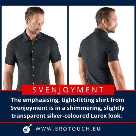 The emphasising, tight-fitting shirt from Svenjoyment is in a shimmering, slightly transparent silver-coloured Lurex look. It has short sleeves, a stand-up collar and a row of press studs at the front. It is soft and stretchy for a very comfortable fit.