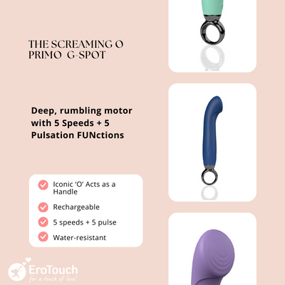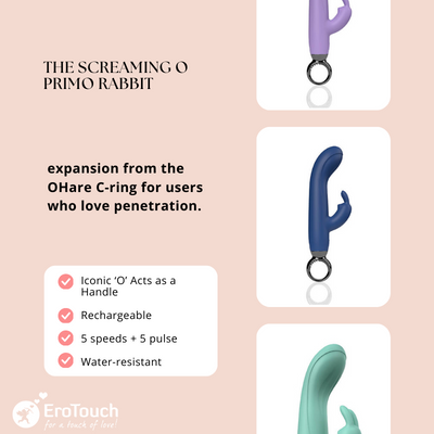 The classic shape of a rabbit vibrator is a perennial favorite, and the Screaming O PrimO Rabbit is an elegant expansion from the OHare C-ring for users who love penetration. With 5+5 FUNctions, the PrimO delivers 5 steady vibrations speeds followed by 5 pulse patterns at the touch of a button.