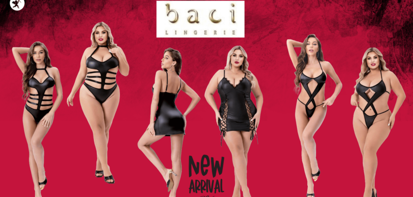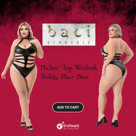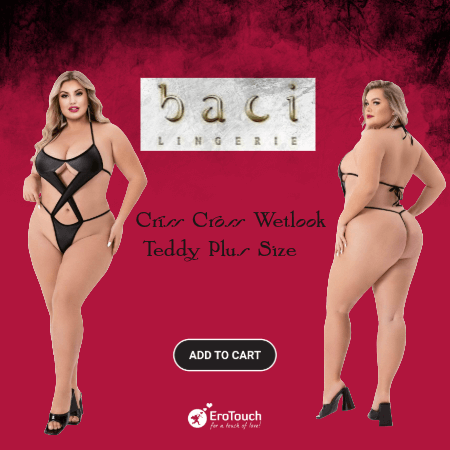 Turn up the heat with Baci’s wetlook black teddy, crafted from 100% polyester for a sleek, form-fitting finish.