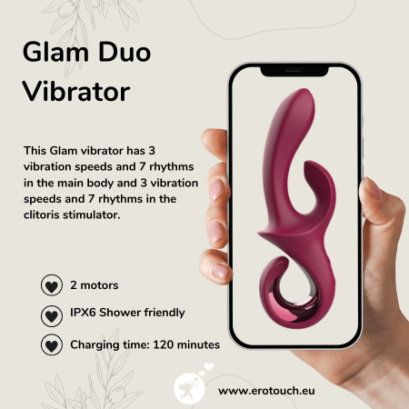 Duo vibrator with big top. This Glam vibrator has 3 vibration speeds and 7 rhythms in the main body and 3 vibration speeds and 7 rhythms in the clitoris stimulator.