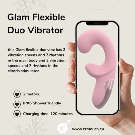 Duo vibrator with flexible shaft. this Glam flexible duo vibe has 3 vibration speeds and 7 rhythms in the main body and 3 vibration speeds and 7 rhythms in the clitoris stimulator.