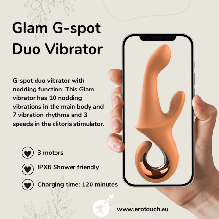 G-spot duo vibrator with nodding function. This Glam vibrator has 10 nodding vibrations in the main body and 7 vibration rhythms and 3 speeds in the clitoris stimulator.